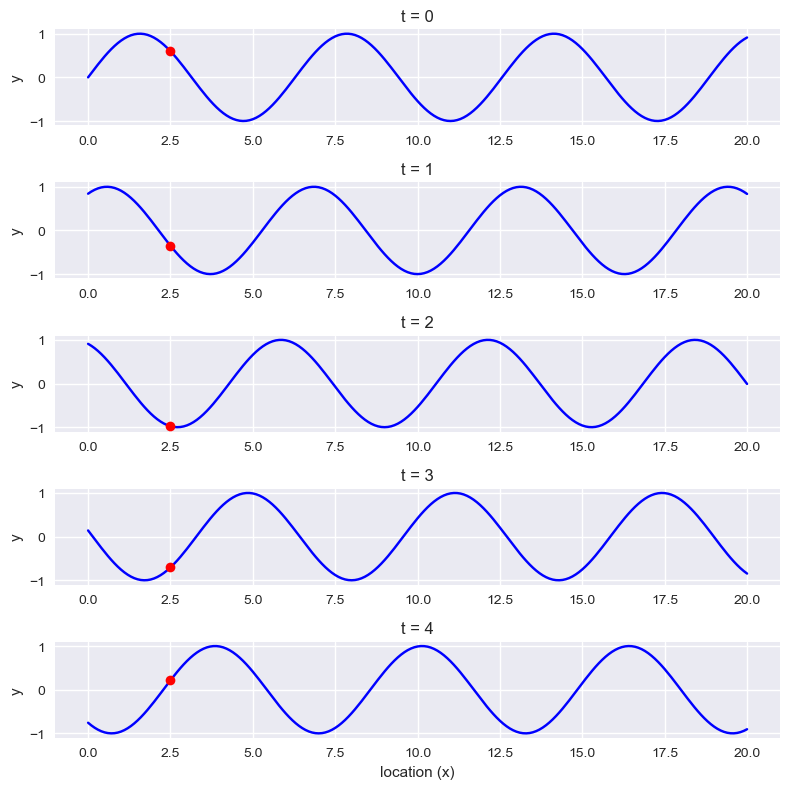 In the figure below, we mark a fixed point at \(x=2.5\) as a red dot. As the wave propagates, the value at that point varies over time even though the point does not move.